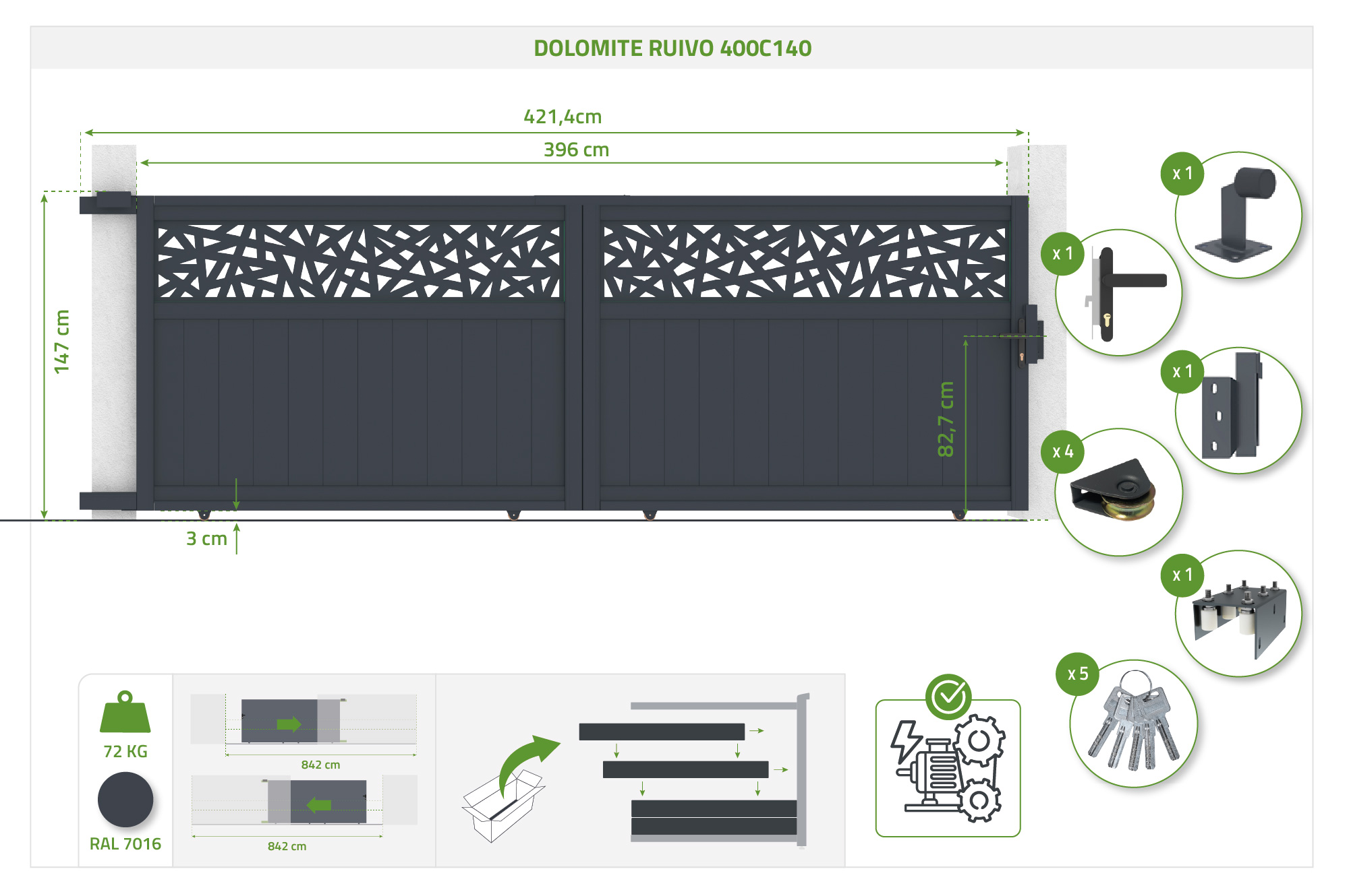 Alle accessoires die nodig zijn voor de installatie van uw portaal worden aan u verstrekt en alles wat in onze portalen is opgenomen, wordt gespecificeerd in de technische kenmerken van het product en in de beschrijving.
